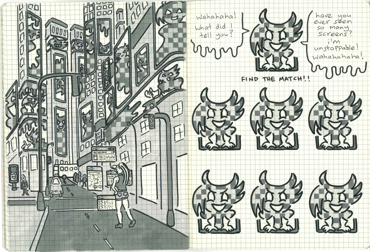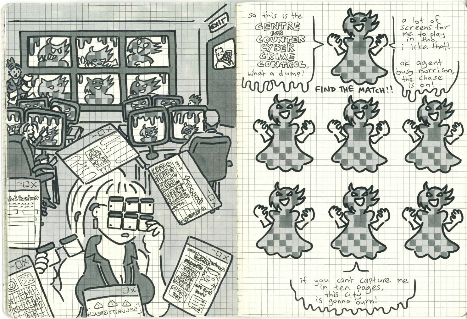 The dangerous and annoying cyber-anarchist Iris The Virus is on the run! Agent Busy Morrison has the tools to catch her, if she can see through Iris's copies and find which illusion is the real deal. 13 pages of find-the-match puzzle action.
