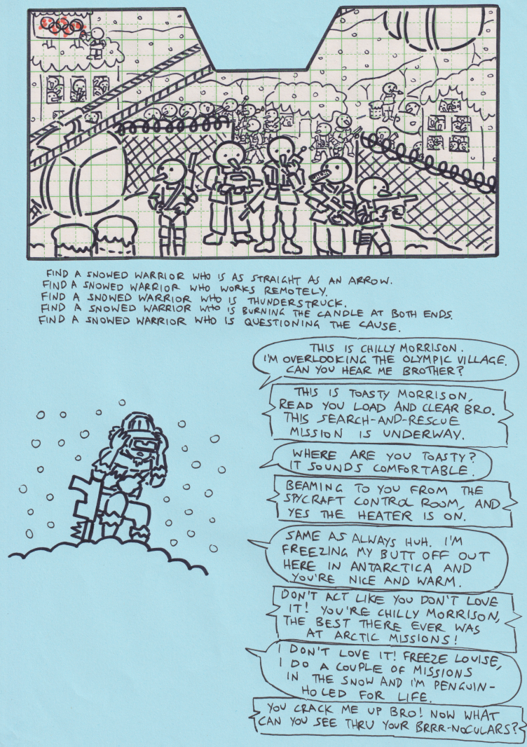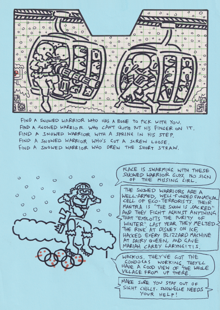 Exfiltrate the cold zone! Chilly Morrison is behind enemy lines on a search-and-rescue mission, but there is an avalanche of Snowed Warrior soldiers standing in his way. Look through Chilly's BRRR-NOCULARS and find the unique Snowed Warriors hidden on every page, but be careful, nothing is as it seems in this exciting story of eco-espionage and naughty nanomachines. An illustrated 21 page pdf with 18 search-and-find puzzles.